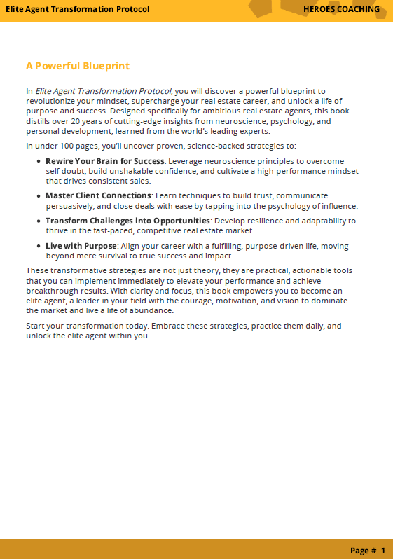 Double your closings and build a thriving career, smarter, not harder, with the Elite Agent Transformation Protocol eBook.